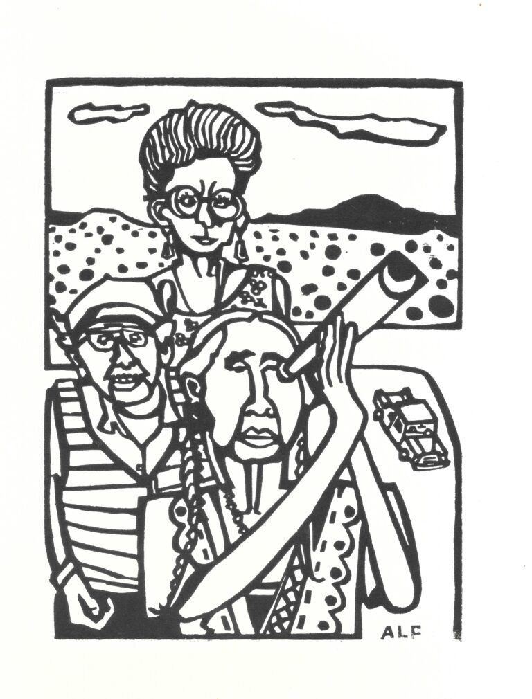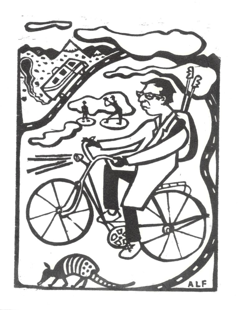 I was 6 feet tall by the time I turned 12. That summer, I slept for 2 months straight but when I finally woke up, the pains in my legs were gone. So I began moving furniture. My high school ceramics teacher gave me a piece of plywood and an x-acto knife and showed me how to cut the plywood for relief printmaking. Years later, I figured out how to print the cuts. My first attempt was inking the wood and then having someone drive a car over the inked wood on paper. This technique had mixed results. mostly bad. But all things are in some form, a state of becoming…. I tune and repair pianos and reed organs, raise chickens, turkeys and quail and am currently working on a book of woodcuts about the process of leaving nature to go drive a car.