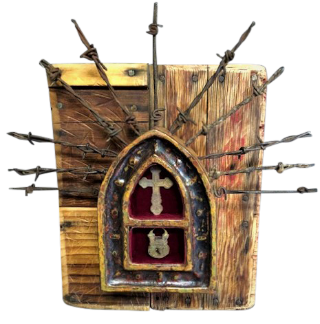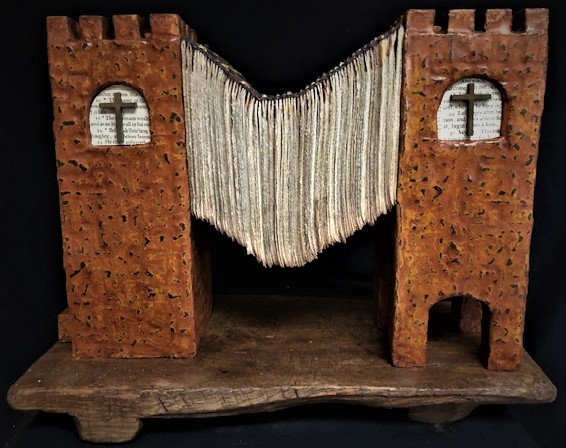 Jim Baker is a New Mexican multi-media artist working in the creation of three-dimensional altered Bibles and Christian art. Jim’s art is noted for combining antique altered Bibles with Biblical symbols, metaphors, and artifacts to inspire devotion and worship of God, to provoke spiritual conversations, and uncover the often-hidden meaning in Holy Scripture. It’s not surprising that Jim’s 40 years of experience as a Baptist minister informs his sacred artwork. “My art conveys the belief that Holy Scripture cannot be fully interpreted and applied without metaphor, symbol, and story. My art reflects the deep connection between the Holy Scriptures of my Judeo-Christian faith tradition and the metaphors, stories, and symbols requisite to their understanding. The inspiration to reclaim and re-stich old Bibles (1700’s – 1800’s) of different languages that are no longer in use comes from the word religion, derived from the Latin word Re-ligio, meaning to re-bind…..a word used in Scripture to reflect God’s desire to re-connect us to Him, to our true selves, and to others.” Jim’s sacred art can be found in galleries in Santa Fe, Taos, and Jemez Springs as well as in churches, schools, religious institutions, homes, and businesses – wherever people want creative and inspirational art to express and experience their faith. Jim’s art is also available through his online gallery, SacredStructuresArt.com