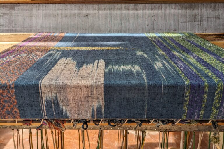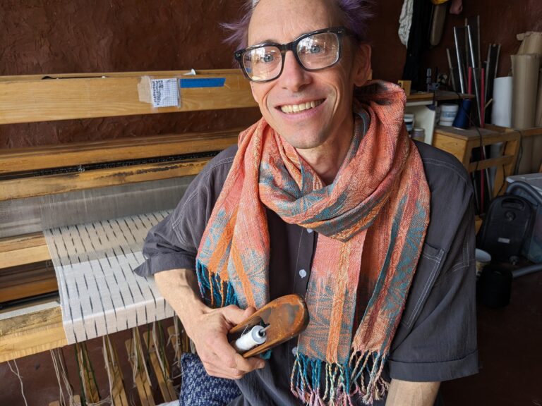 Pando Speer and Dain Daller are The Warp Zone. Their weaving incorporates ikat dye techniques paired with shibori and a variety of multi-harness loom controlled patterns. This overlaying of multiple design elements creates the unique complexity and richness found in Warp Zone textiles. In their studio, cotton, silk, and linen yarns are treated with care and inspiration to become fine wearable art. The work of the Warp Zone has been shown both nationally and internationally, including The World Ikat Textile Symposium in 2016 in New Delhi, India and 2017 in Khon Kaen, Thailand. Pando and Dain will also be showing a selection of their unique up-cycled clothing items. They live and work in their completely handmade off-grid Earthship home and studio in Northern New Mexico.