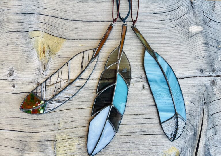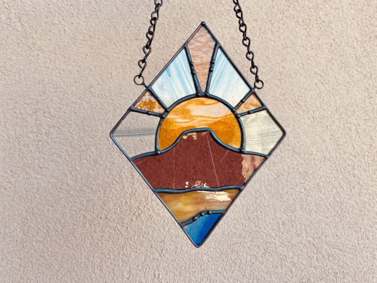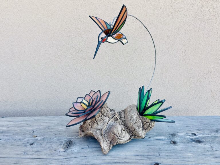 My world of stained-glass art started about 12 years ago. I enjoy mixing colorful glass with the native wood elements such as cholla and cedar. In using the colors of the New Mexico landscape I pick out the textures and striations of glass which adds movement to my pieces, almost like a painting. I consider my work to be eclectic designs that will add that perfect accent for your window, home, or something to add sparkle and beauty to your world. All of my pieces are hand cut using the Tiffany technique-stained glass, which is a method of forming a design by hand cutting my glass, copper foiling each glass piece and then soldering the patterned pieces of glass together to create gorgeous art. I choose to work exclusively with this construction since it allows for more detail.