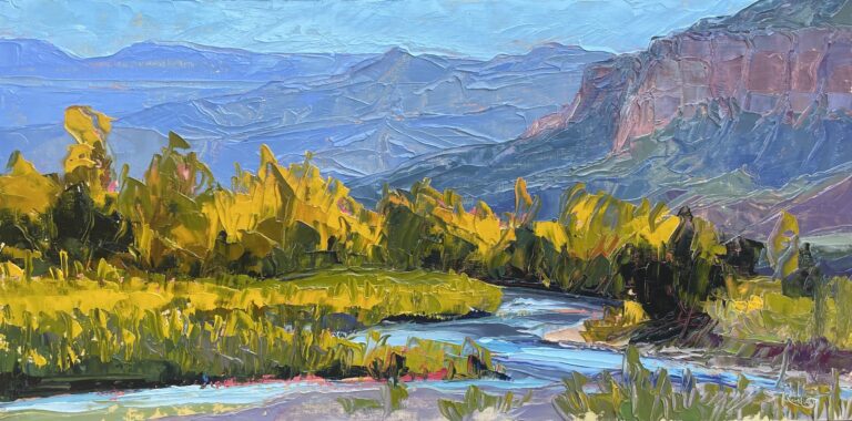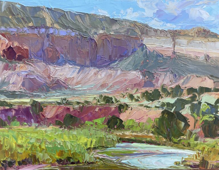 Plein air oil painter Sarah Grenzeback is inspired to get out her palette knife and easel by the open skies, pure light, and rich colors of the wild New Mexico landscape. She paints on site typically in one session, seeking to capture the moment … before the sun moves, or it starts raining. Her favorite pastime is to camp along the Chama River, roll out of her tent in the morning, and find a new spot to set up her easel. She is grateful to the land that surrounds and holds us through everything. Sarah also creates abstract mixed-media work: she enjoys the process of discovery through letting her body, emotions and senses lead and allowing the image to emerge from the process. Since she was little, Sarah always wanted to be an artist like her grandmother, who worked with both oils and mixed media. Sarah studied art and oil painting at Brown University, the Rhode Island School of Design, The Art League School of Alexandria, VA, and with several New Mexico plein air artists. She also has a masters in Art Therapy from Southwestern College in Santa Fe, and is a practicing therapist.